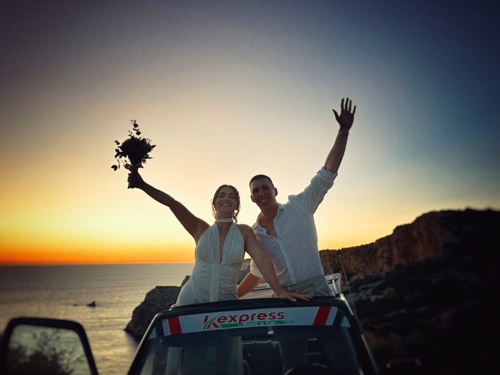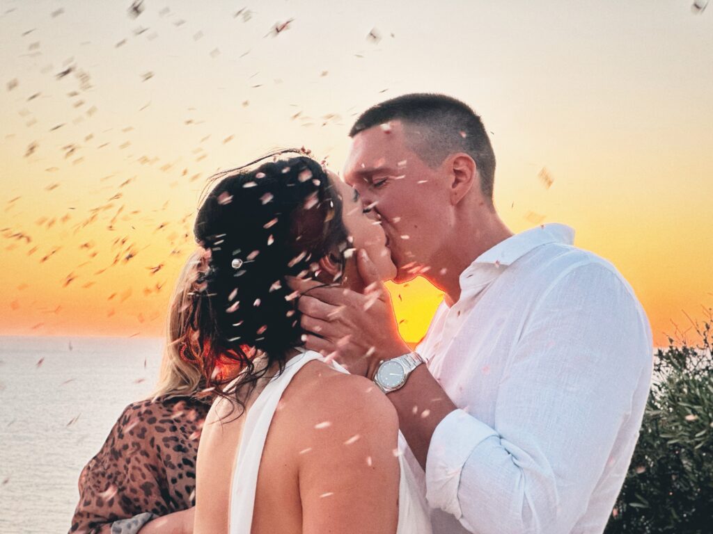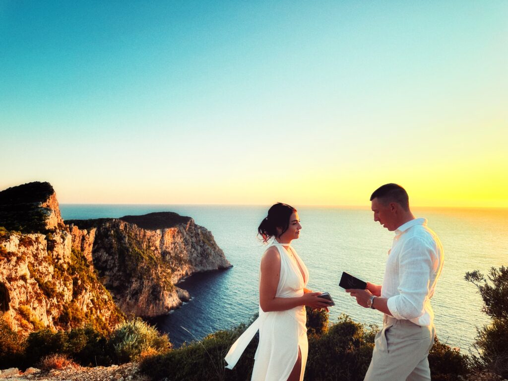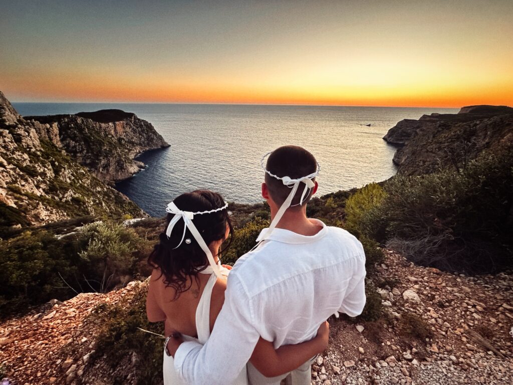 When you picture a dream wedding in Zakynthos, you imagine endless blue seas, golden sunsets, and that shimmer of island magic that only Greece can offer. For Markus and Laura, who travelled from Austria, that dream became reality. Their intimate just-us-two ceremony took place on the breathtaking west-coast cliffs of Zakynthos, timed perfectly with the setting sun.